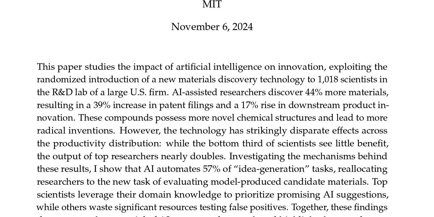 Consider the groundbreaking study by Aidan Toner-Rodgers on AI in scientific discovery. By introducing an AI-driven materials discovery platform to R&D scientists, researchers saw a 44% increase in discoveries, a 39% rise in patent filings, and a 17% boost in product innovation. Notably, these discoveries led to more radical innovations, not just incremental improvements. But the real insight lies in how AI achieved this.
